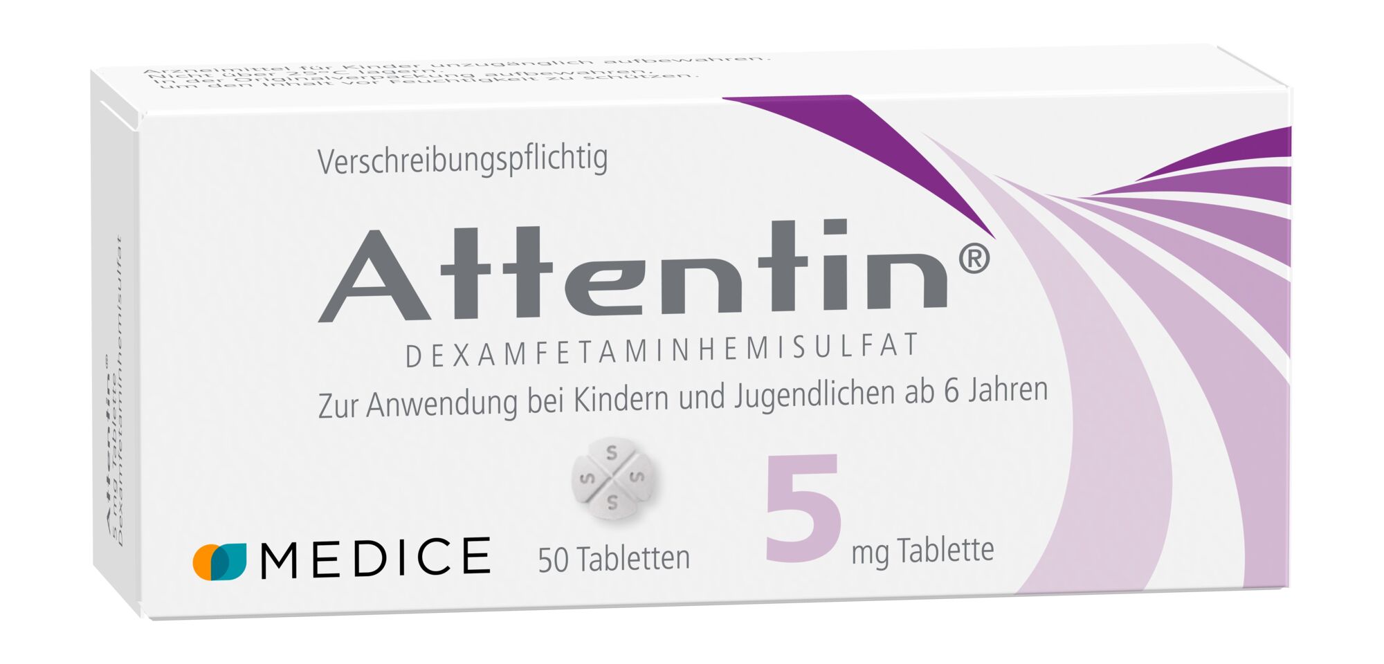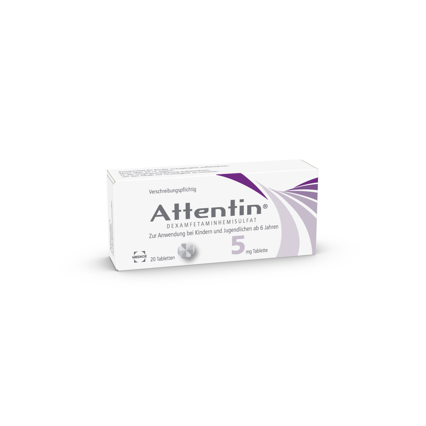 Lesen Sie die gesamte Packungsbeilage sorgfältig durch, bevor Sie oder Ihr Kind mit der Einnahme dieses Arzneimittels beginnen. • Heben Sie die Packungsbeilage auf. Vielleicht möchten Sie diese später nochmals lesen. • Wenn Sie weitere Fragen haben, wenden Sie sich an Ihren Arzt oder Apotheker. • Dieses Arzneimittel wurde Ihnen oder Ihrem Kind persönlich verschrieben. Geben Sie es nicht an Dritte weiter. Es kann anderen Menschen schaden, auch wenn diese die gleichen Beschwerden haben wie Sie oder Ihr Kind. • Wenn Sie Nebenwirkungen bemerken, wenden Sie sich an Ihren Arzt oder Apotheker. Dies gilt auch für Nebenwirkungen, die nicht in dieser Packungsbeilage angegeben sind. Siehe Abschnitt 4. Gebrauchsinformation: Information für Patienten Attentin® 5 mg, Tabletten Dexamfetaminhemisulfat Zur Anwendung bei Kindern und Jugendlichen ab 6 Jahren Diese Packungsbeilage beinhaltet: 1. Was ist Attentin 5 mg und wofür wird es angewendet? 2. Was sollten Sie oder Ihr Kind vor der Einnahme von Attentin 5 mg beachten? 3. Wie ist Attentin 5 mg einzunehmen? 4. Welche Nebenwirkungen sind möglich? 5. Wie ist Attentin 5 mg aufzubewahren? 6. Inhalt der Packung und weitere Informationen 1. Was ist Attentin 5 mg und wofür wird es angewendet? Was ist Attentin 5 mg? Attentin 5 mg verbessert die Aktivität bestimmter nicht ausreichend aktiver Teile des Gehirns. Das Arzneimittel kann helfen, die Aufmerksamkeit (Aufmerksamkeitsspanne) und Konzentration zu erhöhen und hyperaktives/impulsives Verhalten zu verringern. Wofür wird Attentin 5 mg angewendet? Attentin wird angewendet zur Behandlung der AufmerksamkeitsdefizitHyperaktivitätsstörung (ADHS). • Es wird angewendet bei Kindern und Jugendlichen im Alter von 6‑17 Jahren. • Es ist nicht für alle Kinder mit ADHS angezeigt. • Es wird nur angewendet, wenn ein Arzneimittel mit dem Wirkstoff Methylphenidat nicht ausreichend wirksam war. • Es soll als Teil eines Behandlungsprogramms angewendet werden, das typischerweise psychologische, pädagogische und soziale Maßnahmen umfasst. 2. Was sollten Sie oder Ihr Kind vor der Einnahme von Attentin 5 mg beachten? Attentin 5 mg darf nicht eingenommen werden, wenn Sie oder Ihr Kind • allergisch (überempfindlich) gegen den Wirkstoff Dexamfetamin oder einen der sonstigen Bestandteile von Attentin 5 mg sind (Die Bestandteile sind im Abschnitt 6 angegeben) • eine bekannte oder angeborene Überempfindlichkeit (Idiosynkrasie) gegenüber Arzneistoffen aus der Gruppe der sympathomimetischen Amine haben • einen erhöhten Augeninnendruck (Glaukom) haben • einen Nebennierentumor haben (Phäochromozytom) • eine Schildrüsenüberfunktion haben • eine Essstörung haben, bei der Sie oder Ihr Kind keinen Hunger verspüren oder nichts essen wollen – beispielsweise bei „Magersucht“ (Anorexia nervosa) • einen sehr hohen Blutdruck oder eine Verengung der Blutgefäße haben, was Schmerzen in Armen und Beinen verursachen kann • jemals Herzprobleme, wie einen Herzinfarkt, unregelmäßigen Herzschlag, Schmerzen oder Beschwerden im Brustbereich, Herzschwäche oder eine Herzkrankheit hatten oder mit einer Herzerkrankung geboren wurden • Probleme mit den Blutgefäßen im Gehirn haben oder hatten, wie beispielsweise einen Schlaganfall, Schwellung und Schwächung eines Teils eines Blutgefäßes (Aneurysma), verengte oder verstopfte Blutgefäße oder Entzündung der Blutgefäße (Vaskulitis) • die erbliche Stoffwechselkrankheit Porphyrie haben • derzeit oder in den letzten 2 Wochen ein Mittel gegen Depressionen (bekannt als Monoaminoxidasehemmer) einnehmen oder eingenommen haben – siehe auch den Abschnitt „Einnahme von Attentin 5 mg zusammen mit anderen Arzneimitteln“ • schwer zu kontrollierende ruckartige Zuckungen von Körperteilen oder Wiederholen von Lauten und Wörtern oder andere Bewegungsstörungen haben (Tourette-Syndrom oder Dystonien) • eine psychiatrische Erkrankung haben, wie beispielsweise: - psychopathische Probleme oder eine „Borderline-Persönlichkeitsstörung“ - unnormale Gedanken oder Vorstellungen oder eine Erkrankung, die Schizophrenie genannt wird - Anzeichen einer ernsthaften Stimmungsproblematik, wie: Suizidneigungen schwere Depression, bei der Sie oder Ihr Kind sich sehr traurig, wertlos und ohne Hoffnung fühlen eine Manie, bei der Sie oder Ihr Kind sich außergewöhnlich erregbar, überaktiv und enthemmt fühlen. • drogen-, medikamenten- oder alkoholabhängig sind oder waren • schwanger sind, schwanger werden wollen oder stillen. Nehmen Sie Attentin 5 mg nicht ein, falls einer der oben genannten Punkte auf Sie oder Ihr Kind zutrifft. Falls Sie sich nicht sicher sind, fragen Sie Ihren Arzt oder Apotheker, bevor Sie oder Ihr Kind Attentin 5 mg einnehmen, da dieses Arzneimittel die beschriebenen Probleme verschlimmern kann. Warnhinweise und Vorsichtsmaßnahmen Bitte sprechen Sie mit Ihrem Arzt oder Apotheker, bevor Sie oder Ihr Kind Attentin 5 mg einnehmen. Besondere Vorsicht bei der Einnahme von Attentin 5 mg und die Information des Arztes ist erforderlich, wenn Sie oder Ihr Kind • Leber- oder Nierenprobleme haben • Anfälle (Krampfanfälle, Epilepsie) oder ein anormales EEG (Hirnstromaufzeichnungen) haben oder jemals gehabt haben • hohen Blutdruck haben • ein Herzproblem haben, das nicht im Abschnitt „Sie oder Ihr Kind dürfen Attentin 5 mg nicht einnehmen“ (siehe oben) enthalten ist • an einer psychiatrischen Erkrankung leiden, die nicht im Abschnitt „Sie oder Ihr Kind dürfen Attentin 5 mg nicht einnehmen“ enthalten ist. Zu solchen psychiatrischen Erkrankungen zählen: - Stimmungsschwankungen (Stimmungswechsel zwischen manischer Hochstimmung und Depression – eine sogenannte „bipolare Störung") - beginnende Aggressivität oder Feindseligkeit oder Verschlimmerung der Aggressivität - Dinge sehen, hören oder fühlen, die nicht da sind (Halluzinationen) - Dinge glauben, die nicht real sind (Wahnvorstellungen) - erregt, ängstlich oder