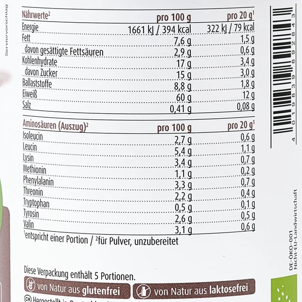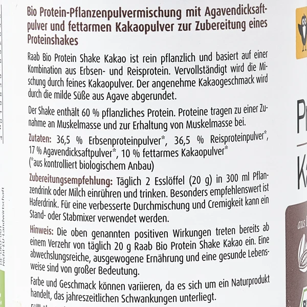 Zutaten36,5 % Erbsenproteinpulver*, 36,5 % Reisproteinpulver*, 17 % Agavendicksaftpulver*, 10 % fettarmes Kakaopulver* (*aus kontrolliert biologischem Anbau)