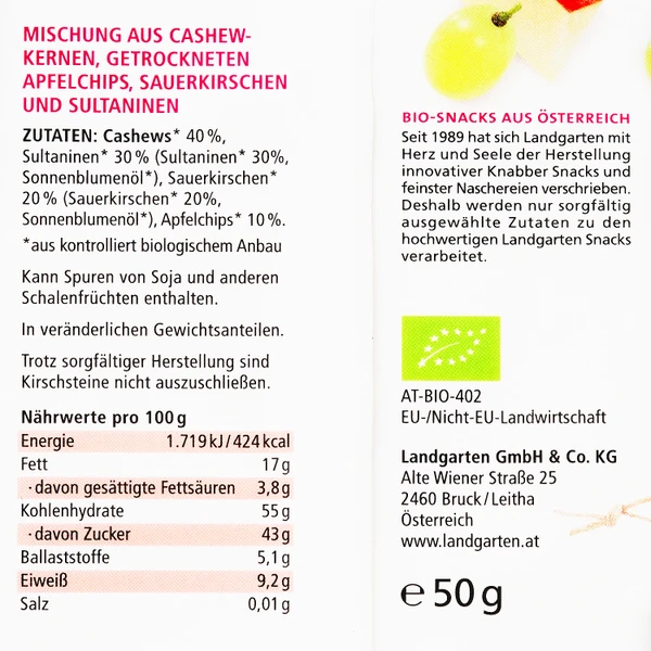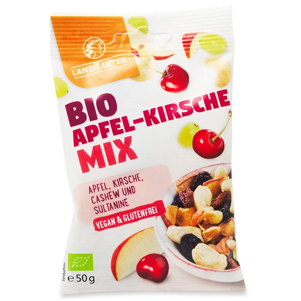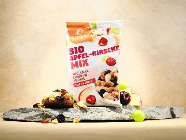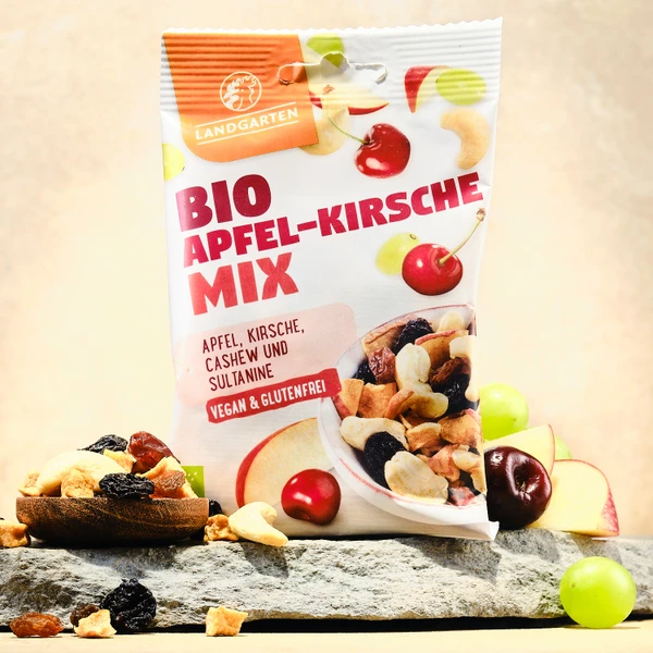 Der Landgarten Bio Apfel Kirsch Mix vereint fruchtige Apfelchips, süß-säuerliche Sauerkirschen, saftige Sultaninen und knackige Cashews zu einer harmonischen Snackmischung. Die Kombination aus cremigen Nüssen und intensivem Fruchtaroma sorgt für ein natürliches Geschmackserlebnis – fruchtig, ausgewogen und voller Genuss bei jedem Bissen.