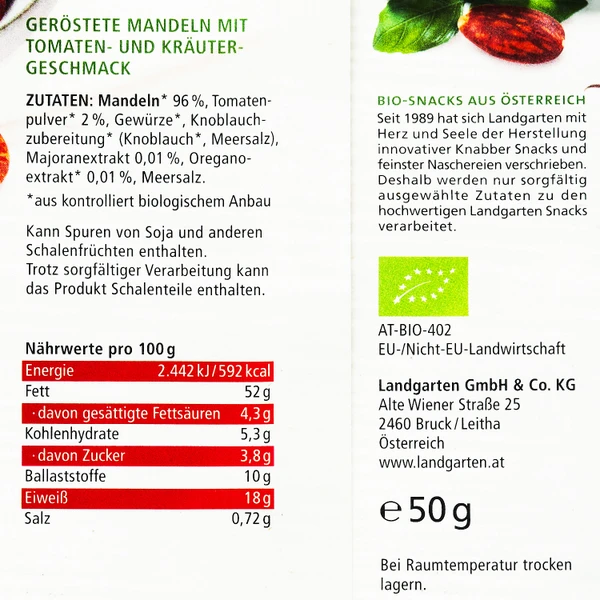 ZutatenMANDELN* 96%, Tomatenpulver* 2%, Gewürze*, Knoblauchzubereitung* (Knoblauch*, Salz), Majoranextrakt 0,01%, Oreganoextrakt* 0,01%, Meersalz.