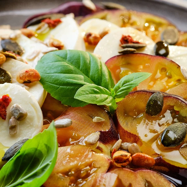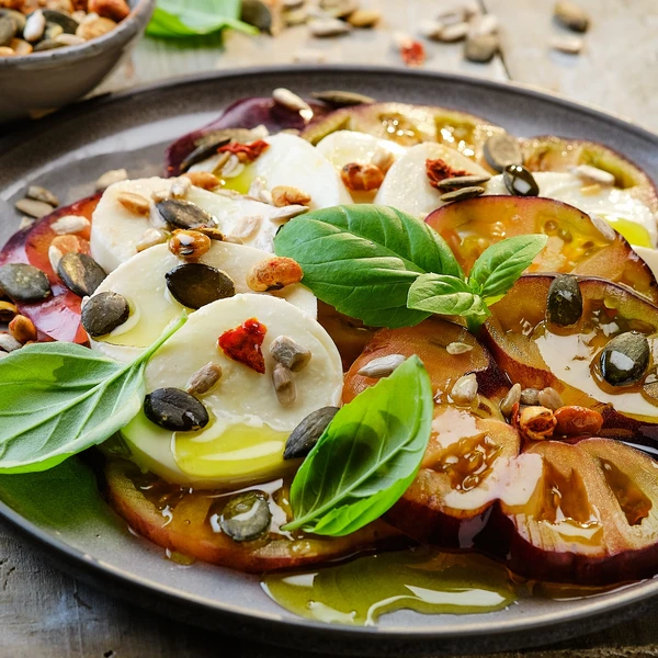 Tomaten-Mozzarella-Salat verfeinern - Ein klassischer Caprese-Salat aus Tomaten, Mozzarella und Basilikum wird mit dem Salattopping noch aromatischer und bekommt eine knusprige Textur.