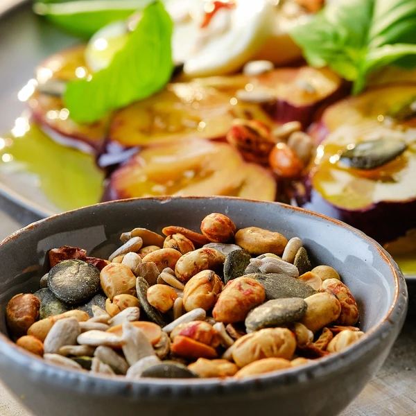 Ofengemüse mit Kern-Topping - Geröstetes Gemüse wie Zucchini, Süßkartoffeln oder Paprika kurz vor dem Servieren mit dem Salattopping bestreuen.