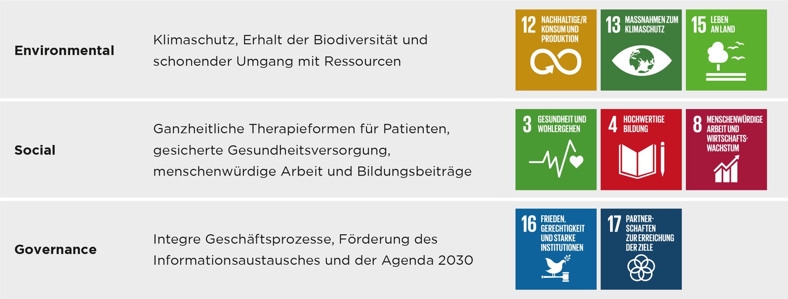 Als mittelständisches Pharmaunternehmen ist die Gesundheit der Menschen Kern unserer unternehmerischen Identität und Fokus einer nachhaltigen Unternehmensentwicklung. Die Auswirkungen unseres Handelns bewerten wir anhand eines integrierten Gesundheitsverständnisses, das psychische, physische, soziale und ökologische Aspekte umfasst. Wir ergreifen konkrete Maßnahmen innerhalb unseres Transformationsprozesses und erreichen positive Zielbeiträge zu international vereinbarten Nachhaltigkeitszielen.