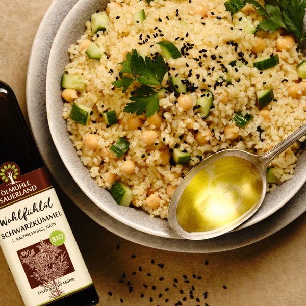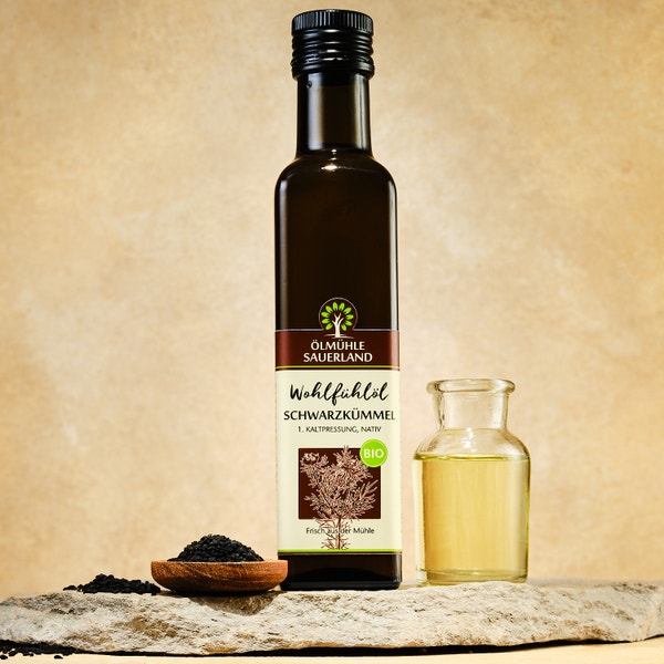 Cold-pressed from Egyptian Nigella sativa, the black cumin oil from Ölmühle Saarland impresses with its aromatic, spicy scent and high content of valuable unsaturated fatty acids. Ideal for oriental dishes, salads, dips or as a special flavouring in everyday cooking – natural, intense and versatile..