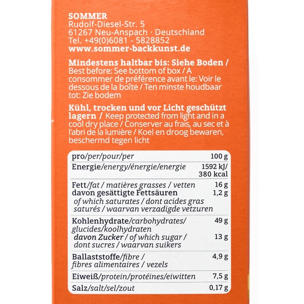 ZutatenDinkelmehl**¹ Type 630 (29%), Dinkelvollkornmehl**¹ (24%), Sonnenblumenöl**, Karotten** (12%), Datteln** (10%), Sultaninen** (8%), Aprikosen** (2%), Meersalz, Backtriebmittel: Natriumcarbonate, Ingwer*, Zitronenöl*.