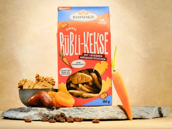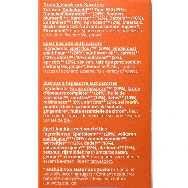 The spelt and carrot cookies are made from carefully selected ingredients from certified organic and biodynamic Demeter cultivation. High-quality spelt flour and whole grain spelt flour form the basis of the recipe and are combined with juicy carrots, sweet dates, and aromatic apricots. Baked with great care and processed using traditional methods, the natural flavors of the ingredients are preserved—without any added sugar.
