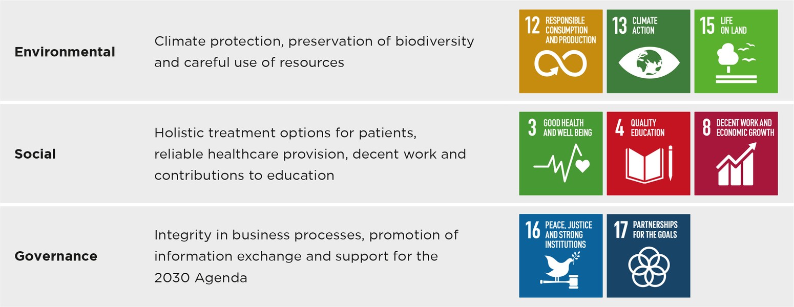 As a medium-sized pharmaceutical company, human health is at the core of our corporate identity and the focus of our sustainable corporate development. We assess the impact of our actions based on an integrated understanding of health that encompasses mental, physical, social and environmental aspects. Within our transformation process we are taking concrete measures and thus making positive contributions to internationally agreed sustainability goals.